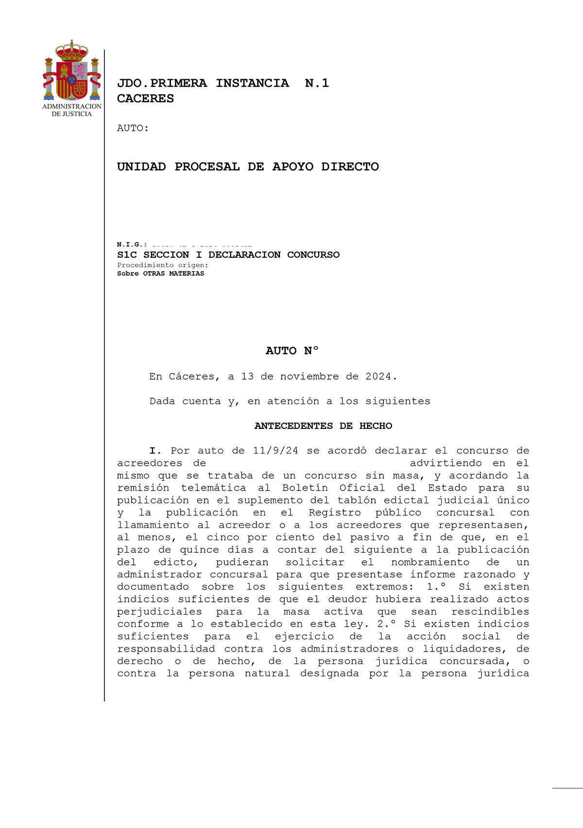 Nuestro cliente, que acumulaba una deuda, ha obtenido un Auto de Conclusión con Concesión de Exoneración del Pasivo Insatisfecho, dictado por el Juzgado de Primera Instancia n.º 1 de Cáceres.