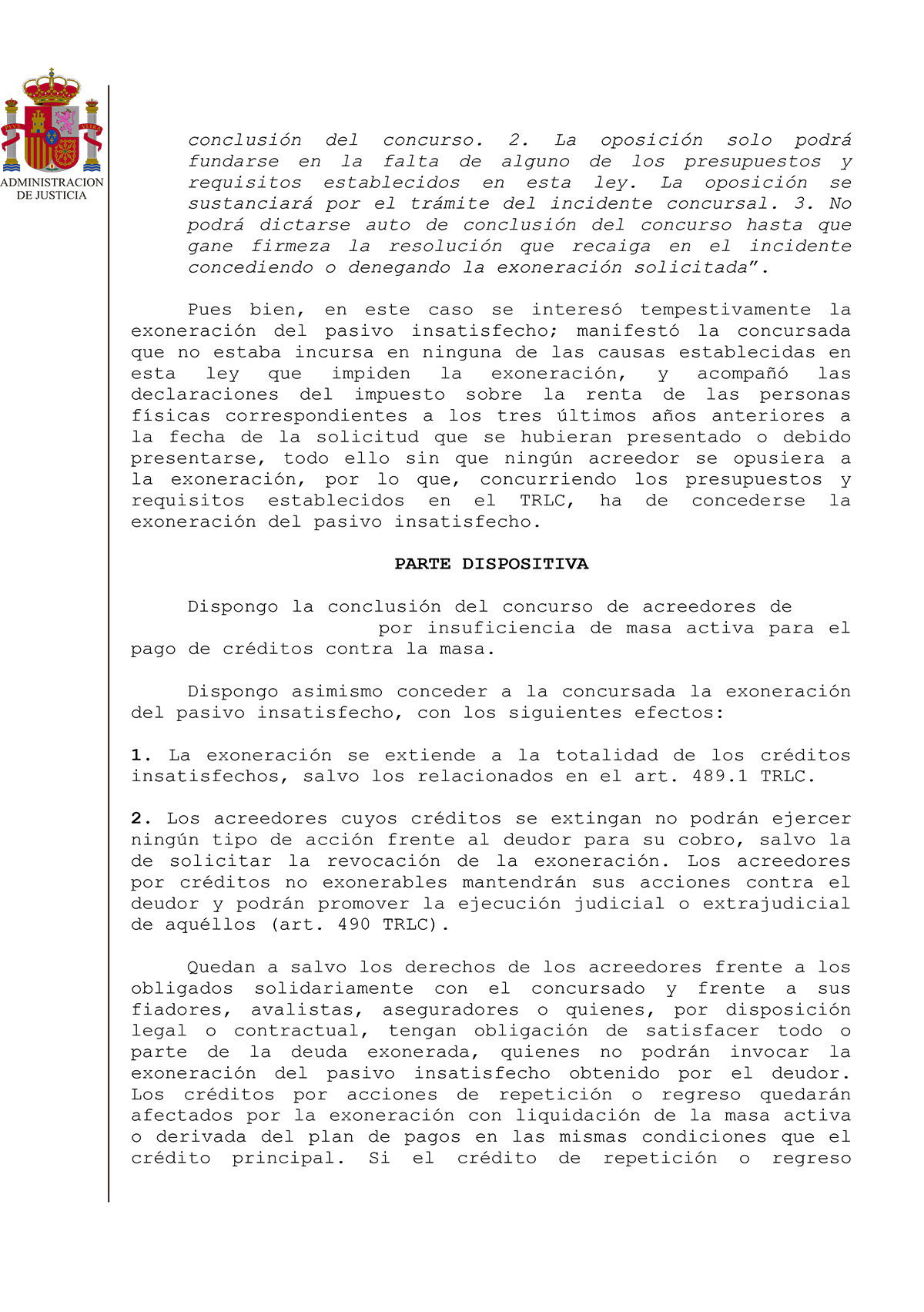 Este caso ha sido tramitado como concurso sin masa, al no existir activos suficientes para satisfacer a los acreedores. Se cumplieron todos los trámites sin oposición por parte de estos, lo que ha permitido al Juez conceder la exoneración definitiva.