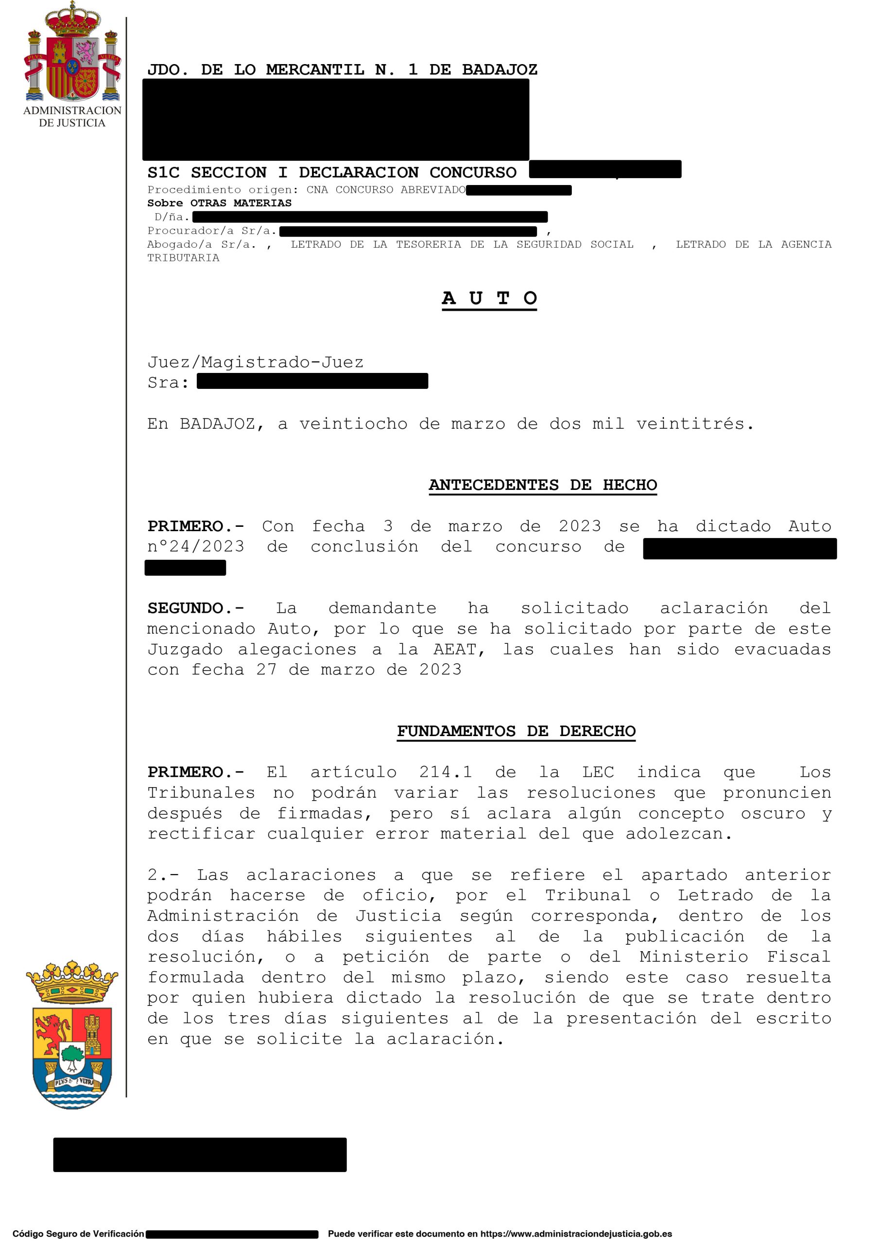 Nuestro despacho ha recibido resolución del Juzgado de lo Mercantil N. 1 de Badajoz por la que se extinguen las deudas de nuestro cliente por importe de 82.300,62€ euros.
