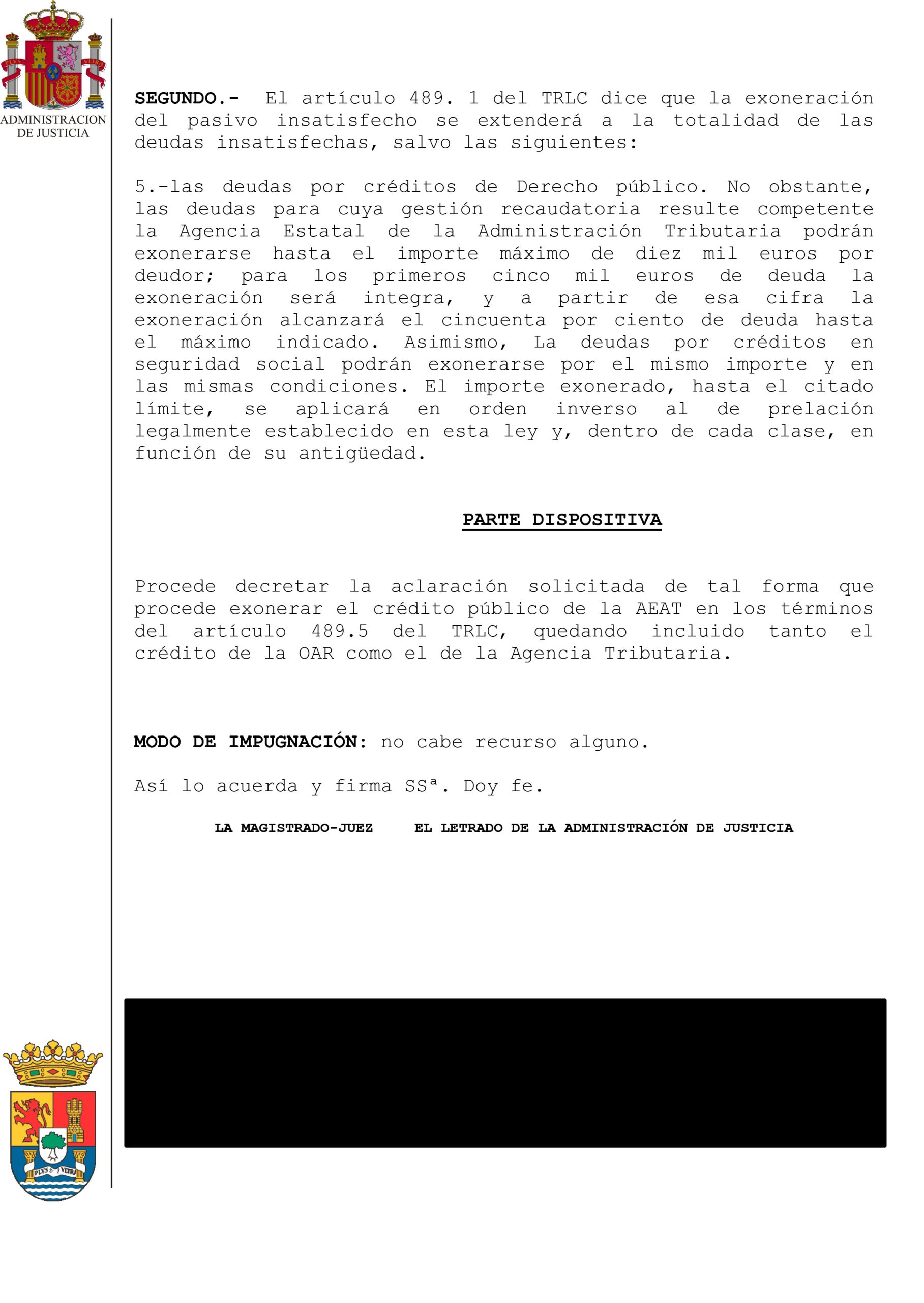 ☑ Procede decretar la aclaración solicitada de tal forma que procede exonerar el crédito público de la AEAT en los términos del artículo 489.5 del TRLC, quedando incluido tanto el crédito de la OAR como el de la Agencia Tributaria.