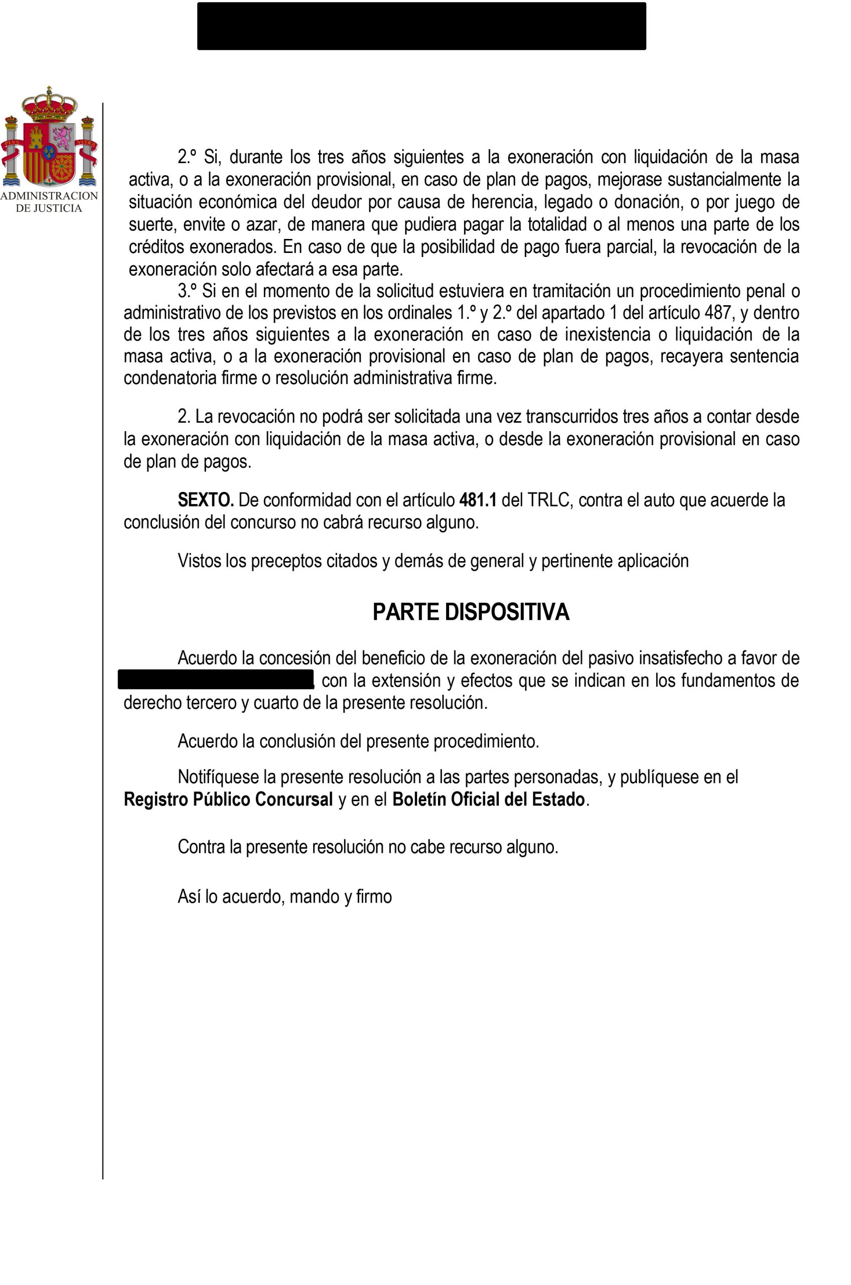 ☑ Acuerdo la concesión del beneficio de la exoneración del pasivo insatisfecho a favor del cliente, con la extensión y efectos que se indican en los fundamentos de derecho tercero y cuarto de la presente resolución.