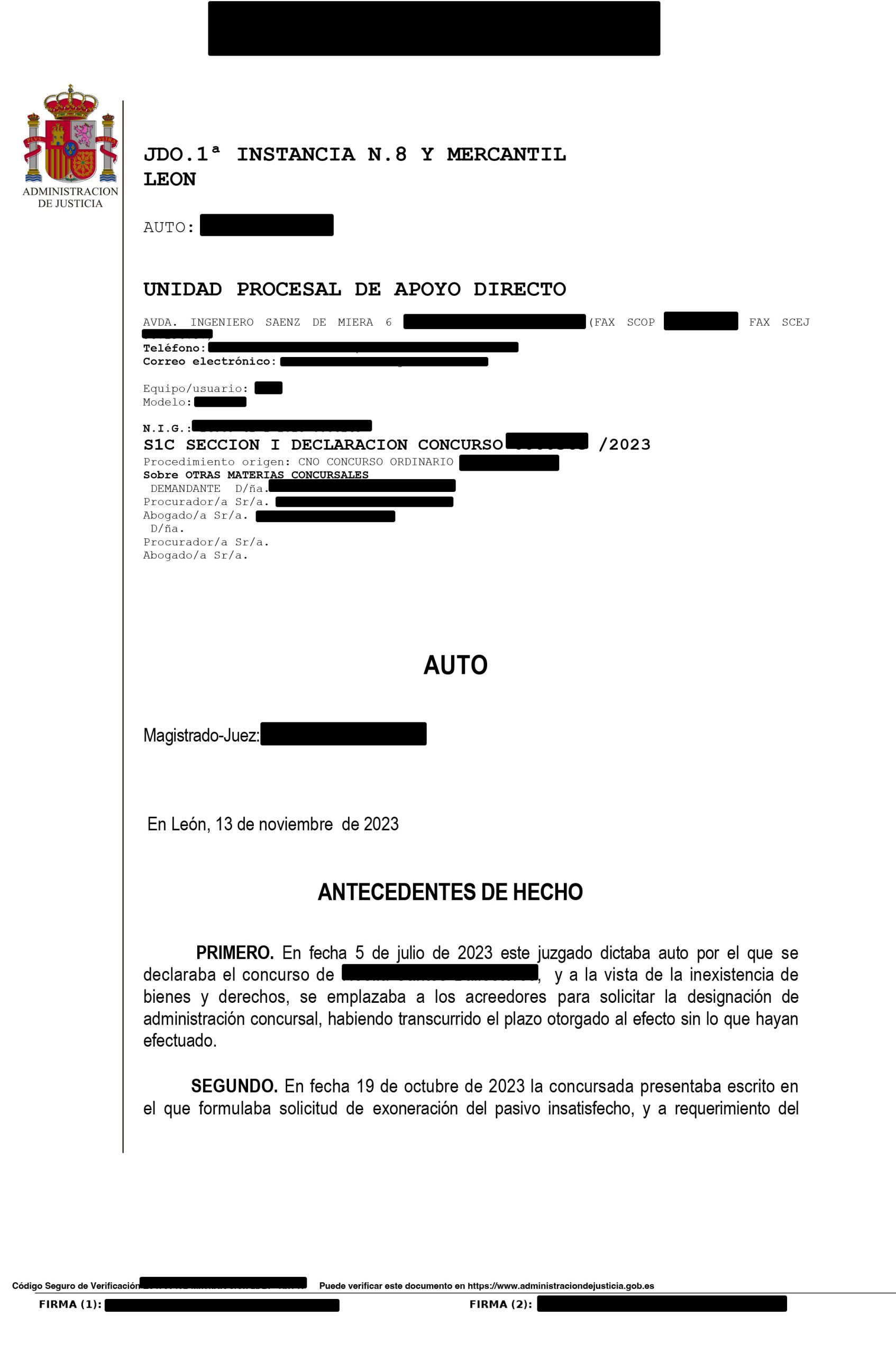 Nuestro despacho ha recibido resolución del Juzgado de Primera Instancia N. 8 y Mercantil de León por la que se extinguen las deudas de nuestro cliente por importe de 44.065€ euros.